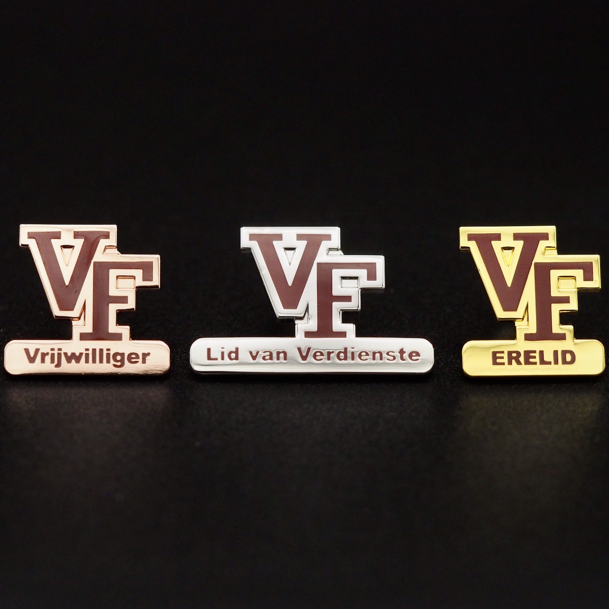 Exclusieve Spelden worden gemaakt in Sterling zilver S925 of in 14 karaat goud. Deze Spelden hebben een zeer luxe uitstraling en elke Speld wordt met de grootste precisie gemaakt. De edelmetalen Spelden worden in Reliëf gemaakt met een Sand blast achtergrond met of zonder emaillen details.